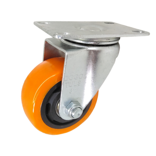 Rueda de PVC Naranja, Horquilla Fabricada en Acero, Terminado en Galvanizado. Aplicaciones: Pisos Lisos, Loseta, Mármol, Madera, Acrílico, No Deja Marcas. Resistencia: Alcoholes, Detergentes, Solventes Ligeros y Sales